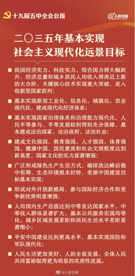 10月29日,中国共产党第十九届中央委员会第五次全体会议公报发布。全会高度评价决胜全面建成小康社会取得的决定性成就,提出了到二〇三五年基本实现社会主义现代化远景目标以及“十四五”时期经济社会发展主要目标。中国将如何实现这一宏伟蓝图,14个关键词速读五中全会公报。
