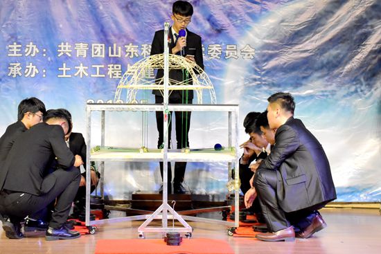 据悉,预赛由四十二支队伍参加,十一支队伍在冲破重重障碍后站到了决赛的舞台上。紧张而激烈的比赛在一段介绍参赛模型背后故事的视频后拉开序幕。首先是模型展示与模型介绍,模型介绍要求每支团队结合PPT进行2分钟的讲解,随后是评委提问。最激动人心的属结构加载环节,每一支队伍都选择不同的加载重量,加载时分为一级荷载、二级荷载和三级荷载。有些队伍在一级荷载时就遗憾失败,而个别队伍坚持到了三级荷载,成功完成了挑战。在决赛的舞台上每一个结构模型都给我们展示不同寻常的力量,观众们随着加载重量的增加而紧张,随着模型的坍塌而感到惋惜,当参赛队伍的模型成功完成了三级荷载时同学们由心地发出赞叹。在十一组模型比拼结束之后,王崇革副院长对本次活动做了最后的点评,他说道:此次比赛让我看到同学们的辛勤付出,十一个模型做得各有千秋。同学们能充分运用所学知识,这让我感到骄傲和自豪!