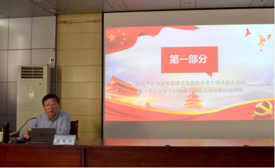 百年征程波澜壮阔,百年初心历久弥坚。张英杰副校长通过讲述国际国内形势、党史故事或标志性事件,引出习近平总书记“七一”重要讲话是激励全党全国各族人民向第二个百年奋斗目标进军的政治宣言和行动纲领,具有重大的政治意义、理论意义、实践意义。张英杰旁征博引、引经据典,指出深入学习贯彻习近平总书记“七一”重要讲话最重要的是联系党的百年奋斗历程,要全面深入领会讲话的丰富内涵、精神实质和思想精髓,深入领会讲话在一系列重大问题上的新论断、新概括,增强贯彻落实的自觉性和针对性,进一步把党的历史学习好、总结好,把党的宝贵经验传承好、发扬好,铭记奋斗历史,担当历史使命,从党的奋斗历史中汲取继续前进的智慧和力量。
