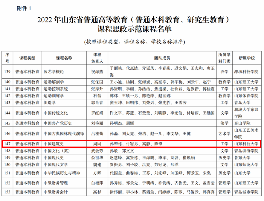 近日,山东省教育厅公布了“普通高等教育课程思政示范课程名单”,必赢官网建筑规划系周同老师主持的《中国建筑史》课程喜获省级课程思政示范项目(项目组成员:周同、孙照栋、付冠男、高静、薛锋),成为必赢官网首个获此项目的课程。这是《中国建筑史》自2021年获得山东省本科一流课程以来,在课程建设方面取得的又一重要成果。