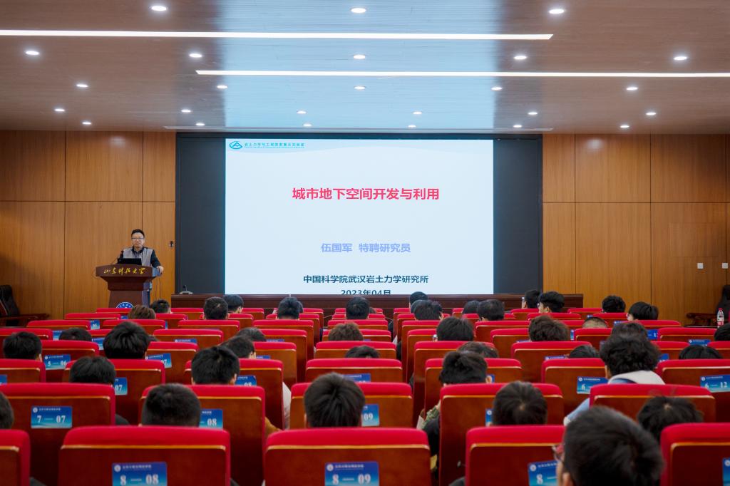伍国军研究员以《城市地下空间开发与利用》为题,从城市地下空间发展前景、开发优势、开发需求、利用情况、当前问题以及团队介绍六个方面进行了具体的讲解,强调了岩土工程和城市地下空间工程的广大前景,希望同学们能博学笃行、知行合一。刘滨研究员就《地下工程施工过程“人-机-岩”信息互馈机理及智能化决策》这一主题,提出了“复合地层隧道掘进机安全高效施工”这一科学目标,并介绍了其研究方向、系所情况、团队情况等内容。赵亮为在场师生介绍了中国科学院武汉研究所的基本情况,从规模、师资等方面展开,带领同学们熟悉和了解中国科学院最新研究生招生政策。会后,中科院武汉岩土所一行领导及专家参观了必赢官网实验室、院史馆等。