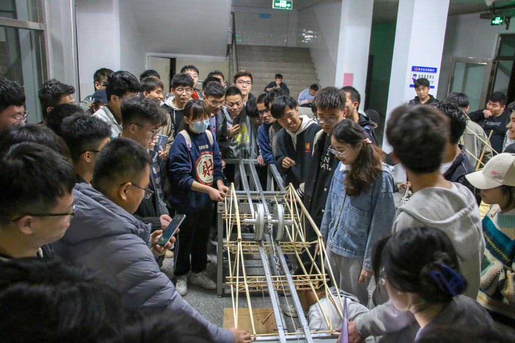 晚上7点,比赛进入到紧张关键的加载环节,林跃忠强调了加载的注意事项,并一一对作品的设计方法、细节等方面给予建议和意见。每一次加载都牵动着选手们的心,既有成功加载之后的欢呼与庆祝,也有失败后对自己模型的惋惜与不甘。但无论胜负,每位来到现场的同学都从自己用心制作的过程以及老师的指导中获得了丰富的经验和有益的建议。经3个多小时的加载环节后,共有10支队伍的模型经过考验,顺利晋级决赛。